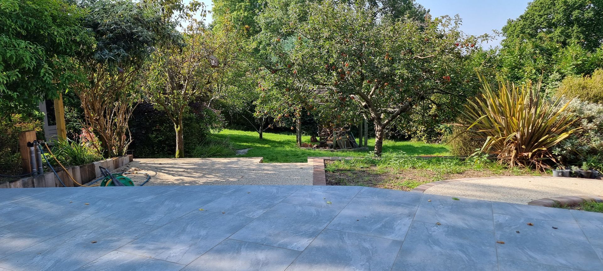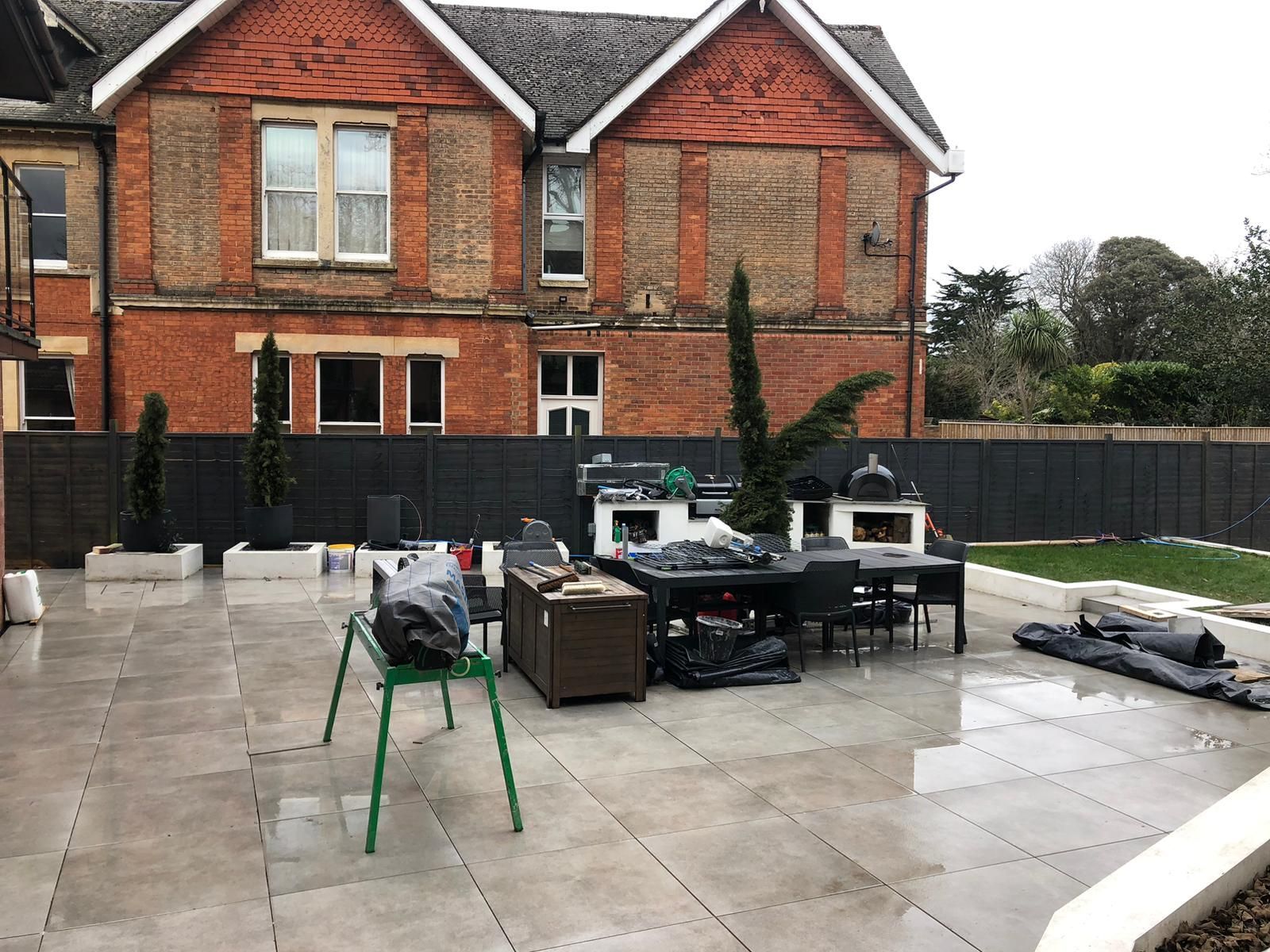 Welcome to our gallery showcasing a beautiful rear garden makeover we completed for a family in Wimborne, Dorset. This project was designed to maximise space while seamlessly blending with the natural surroundings of their established garden and orchard. The centrepiece is a large, hourglass-shaped patio finished in elegant porcelain pavers, creating a sense of depth and allowing the space to flow naturally.
