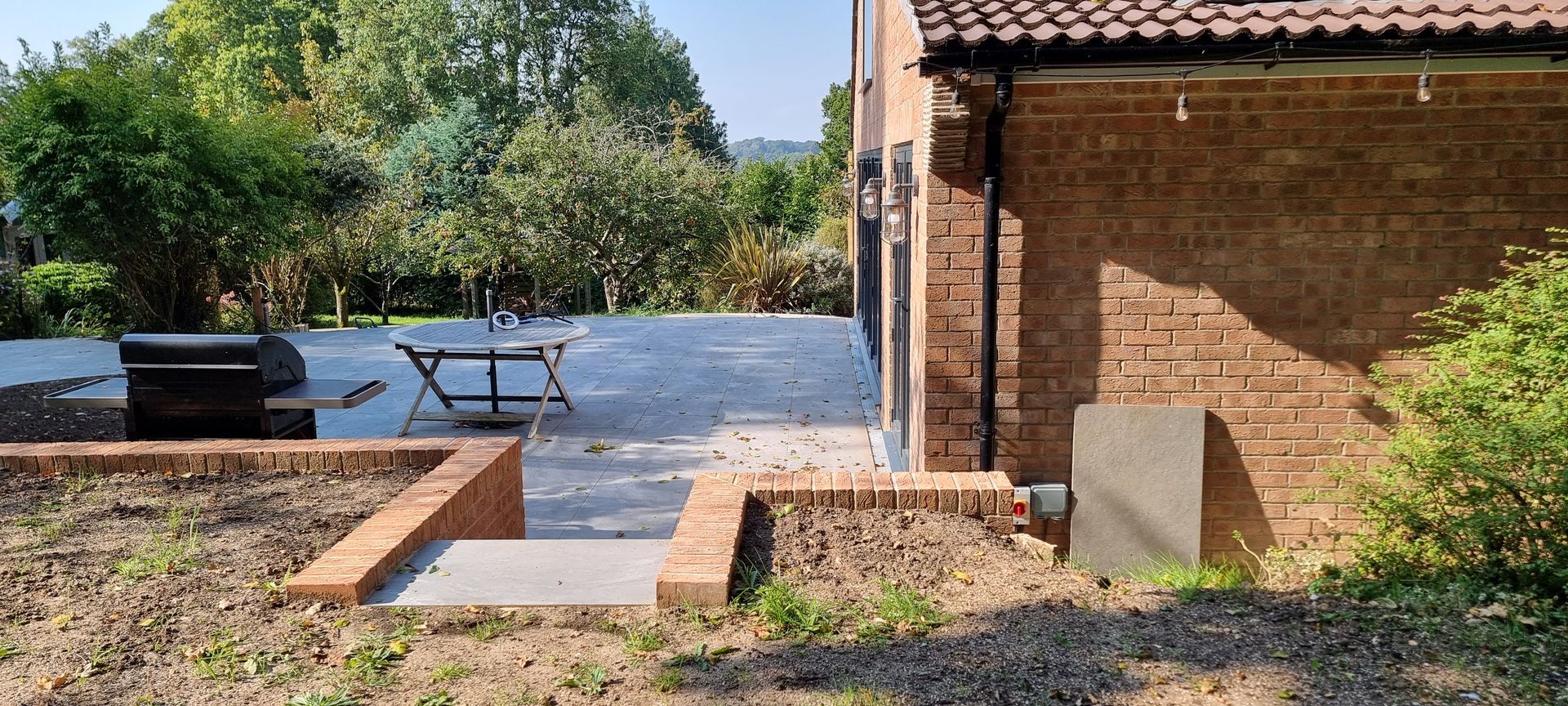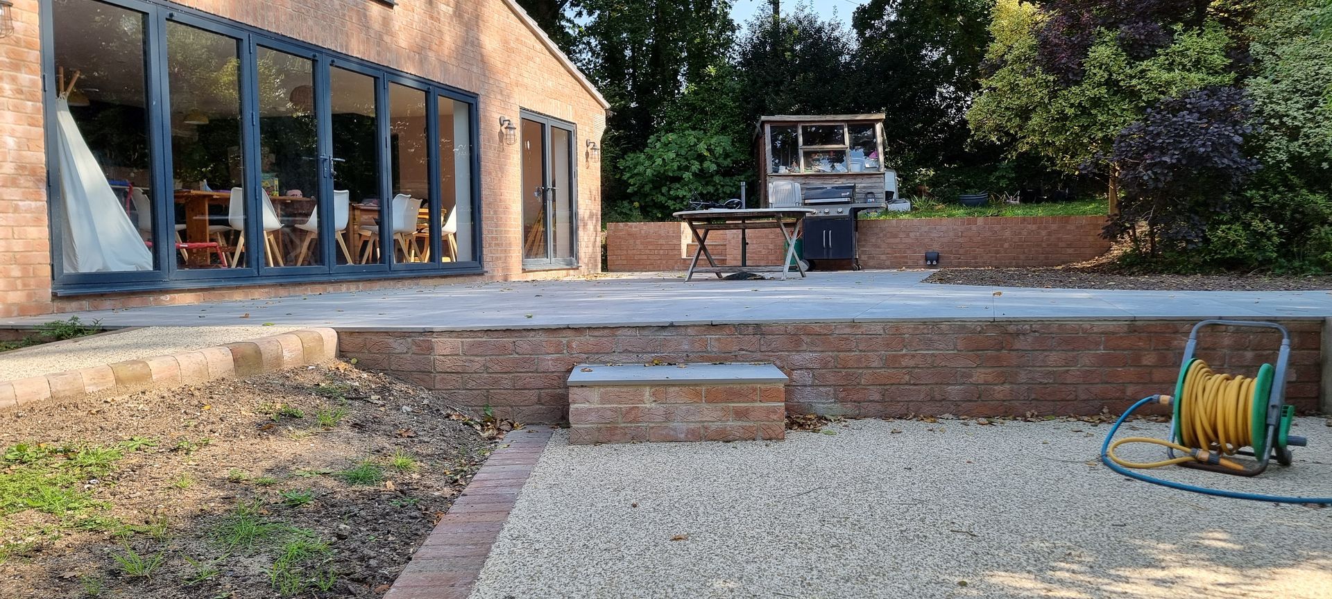 For added functionality, the design features a relaxing seating area at one end and a dining zone near the BBQ for family gatherings. A smooth pathway from the driveway ensures easy access, perfect for manoeuvring a wheelbarrow. To complement the property, we used brick edging that matches the house, adding continuity between indoor and outdoor spaces, while oak sleepers were carefully placed to blend with the garden's mature trees and natural landscape.