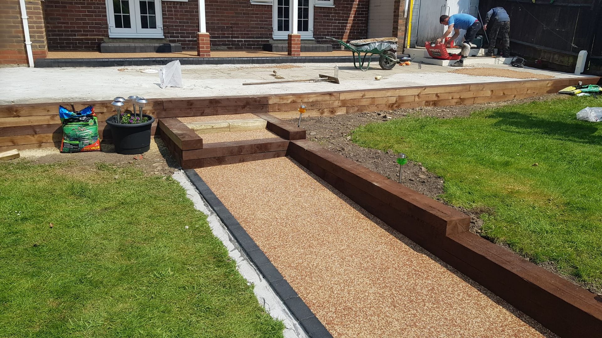 In preparation for a hot tub installation next year, we installed a resin-bound base and all necessary electrics and water connections. With rich soil borders for their love of gardening and oak steps leading to the side of the property, the entire space ties together beautifully. Explore the photos to see how we brought their vision to life!